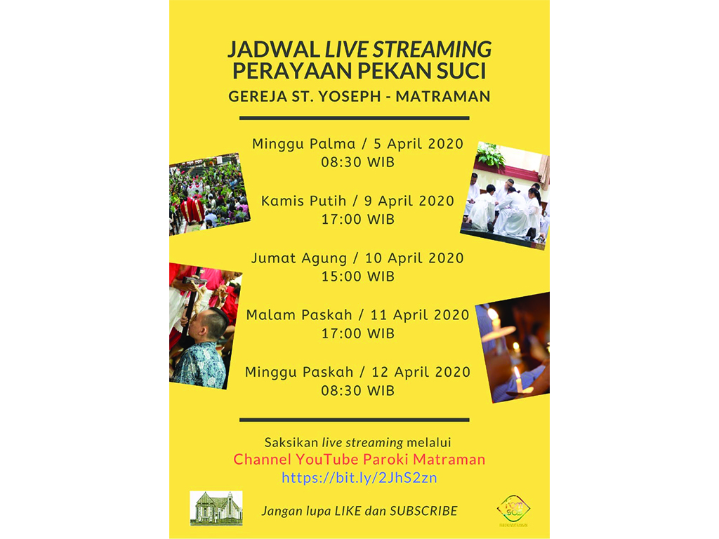 Jadwal Live Streaming Perayaan Pekan Suci Gereja St. Yoseph - Paroki Matraman Minggu Palma / 5 April 2020 Pukul 08:30 WIB Kamis Putih / 9 April 2020 Pukul 17.00 WIB Jumat Agung / 10 April 2020 Pukul 15:00 WIB Malam Paskah / 11 April 2020 Pukul 17.00 WIB Minggu Paskah / 12 April 2020 Pukul 08:30 WIB